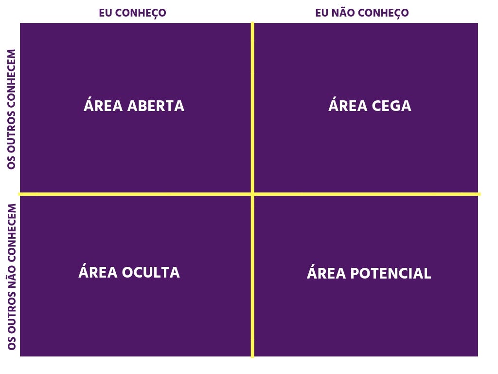 Ao comparar o que você conhece ou não sobre si e o que os outros conhecem ou não sobre si, é possível ter clareza sobre as seguintes áreas da nossa percepção: Área Aberta, Área Oculta, Área Cega e Área Potencial.